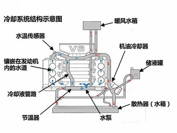 包括水泵、散热器、冷却风扇、节温器、副水箱、发动机机体和气缸盖中的水套。