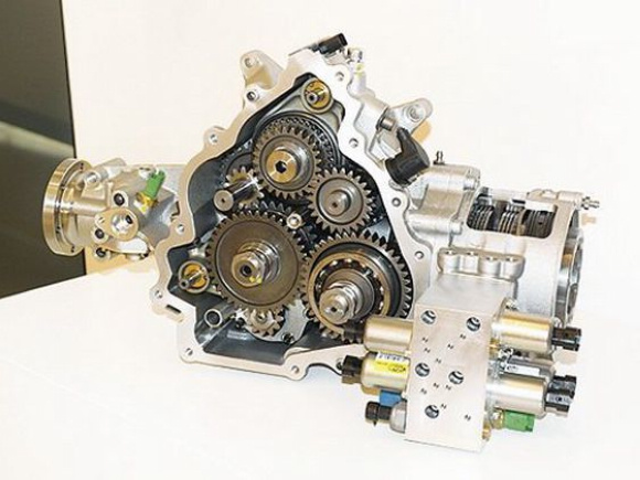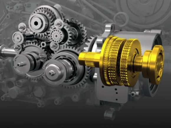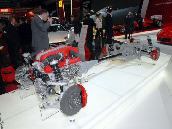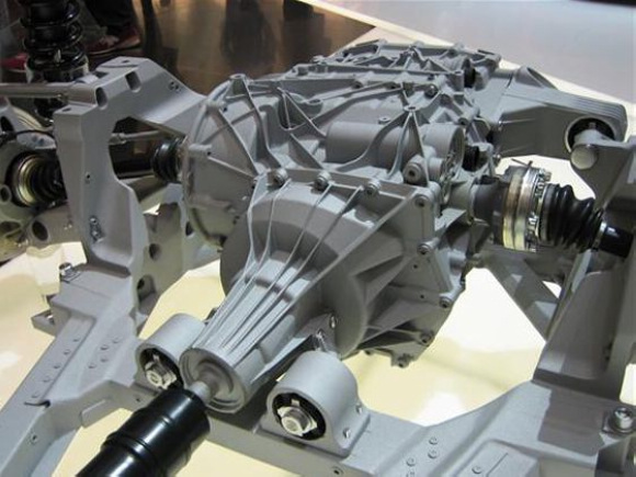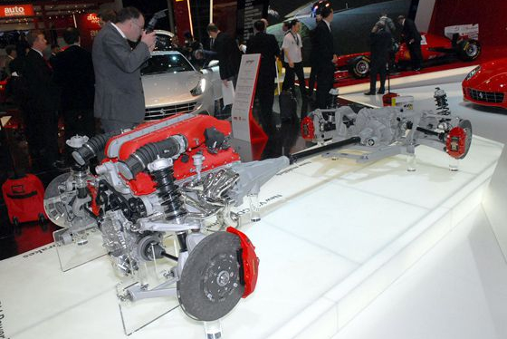 发动机动力直接由曲轴传递至前置变速箱,这台变速箱则通过电控多片式离合器将动力分配给左右两个车轮,因此法拉利FF的前轴并没有差速器。