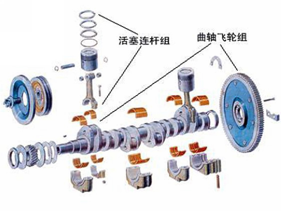 (3)曲轴飞轮组:曲轴、飞轮、扭转减振器、平衡轴