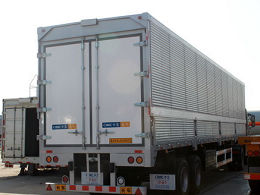 厢式半挂车载货部位为框架结构且无底板,专门运输集装厢的半挂车,第一第三车是拉散货的,中间拉配货的全封闭箱车,适用于家用电器、轻纺货物、煤炭、沙石等建筑材料以及图盘货物的运输。