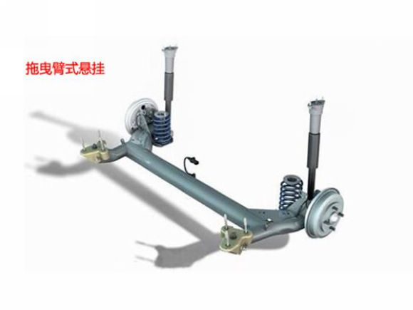 我们常听到的拖曳臂式悬架,就是一种半独立悬架。拖曳臂式悬架是专为后轮而设计的悬架结构,它的构成非常简单,以上下摆动式拖臂来实现车轮与车身或车架的硬性连接,然后以液压减震器和螺旋弹簧充当软性连接,起到吸震和支撑车身的作用,圆柱形或方形横梁则连接左右车轮。