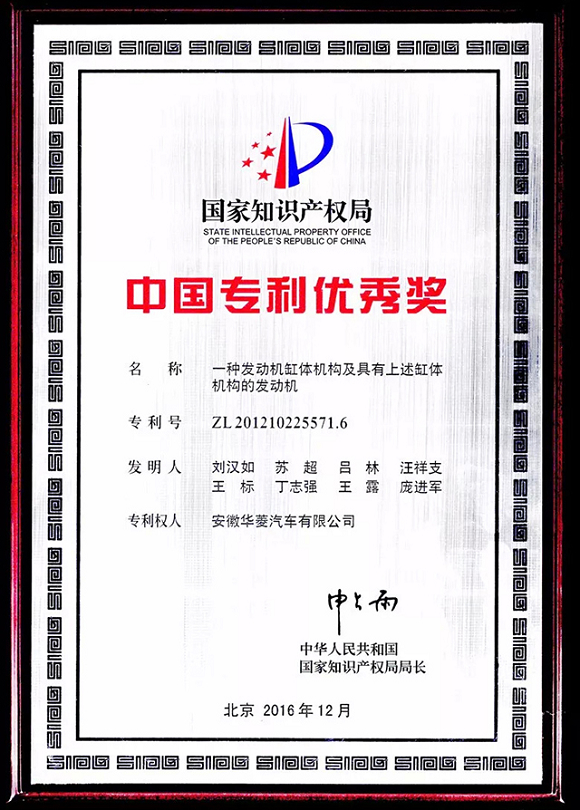 2016年,专利“一种发动机缸体结构及具有上述缸体机构的发动机”获得了2016年第十八届中国专利奖优秀奖,实现了集团公司国家级专利奖项零的突破。这一年,华菱公司首次入围安徽省发明专利百强企业,并成功申报 “汉马”商标为省著名商标。