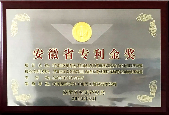 2014年,专利“混凝土泵车泵送双主油缸自动高低压切换和同向伸缩液压装置”获得第三届安徽省专利奖金奖,实现了集团公司省专利金奖零的突破。