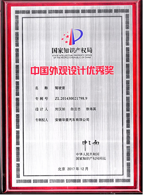 2017年,因年度考核优秀,集团公司破格获得“国家知识产权示范企业”申报资格,并成功获批,而华菱公司也于同年荣获“国家知识产权优势企业”称号。这一年,公司首次参与中国外观专利奖评选,所申报的汉马系列车型的外观设计专利“驾驶室”即获得了中国外观设计优秀奖,该奖项的获得,不仅是集团公司首个国家级该类奖项,也实现了我市该类国家级奖项零的突破,得到了市知识产权局的大力褒奖。也是这一年,公司发明专利“一种气缸盖及其加工方法”被授予“第五届安徽省专利优秀奖”。华菱公司再次入围安徽省发明专利百强企业,且排名较上年提升了8位。