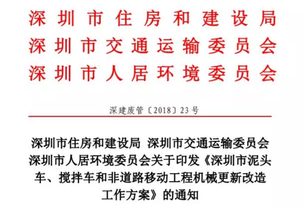 8月24日,深圳市住建局、深圳市交委、深圳人居委三部门,联合印发了《深圳市泥头车、搅拌车和非道路移动工程机械更新改造工作方案》的通知。
