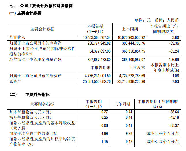 8月29日消息,小康股份发布半年度报告。公告显示,公司半年度营业收入10,453,363,507.34元,同比增加3.8%,归属上市公司股东的净利润236,774,949.82元,同比减少39.36%。