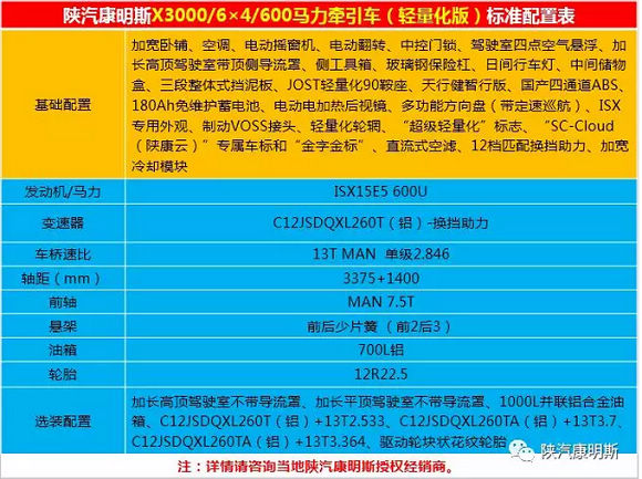陕汽康明斯X3000/6x4/15L600马力牵引车,