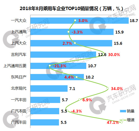 8月乘用车企业中,上汽大众位居第一,销量达到18.7万辆,同比微增3.0%;前十企业中,广汽丰田增幅最大,同比增长47.1%,销量为5.5万辆;上汽通用五菱降幅最大,同比下滑21.3%。