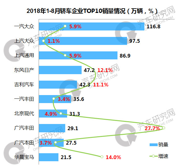 1-8月,轿车企业中,一汽大众位居第一,累计销量达116.8万辆,同比增长5.9%,上汽大众位居其后,销量达到97.5万辆,同比仅微增1.1%;前十企业中,广汽丰田销量表现突出明显,累计增长27.7%。