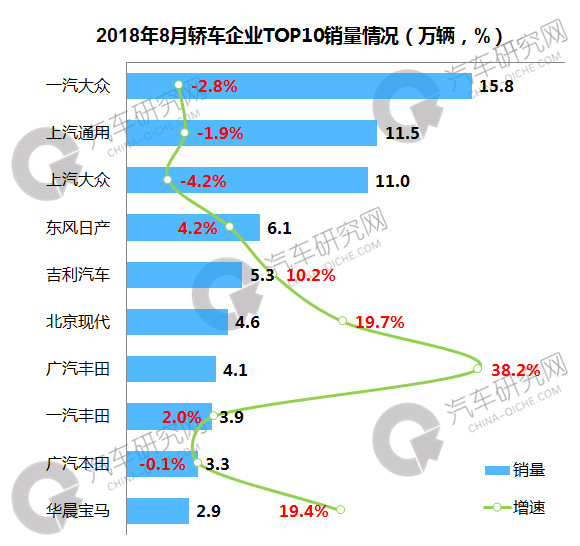 2018年8月轿车企业:广汽丰田单月增速接近40%
