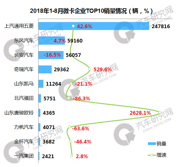 1-8月,微卡企业中,上汽通用五菱位居第一,销量达到247816辆,同比增长42.6%,东风汽车和长安汽车位居第二集团,累计销量均超过55000辆;前十企业中,山东唐骏欧铃增幅最大,同比增长2628.1%。