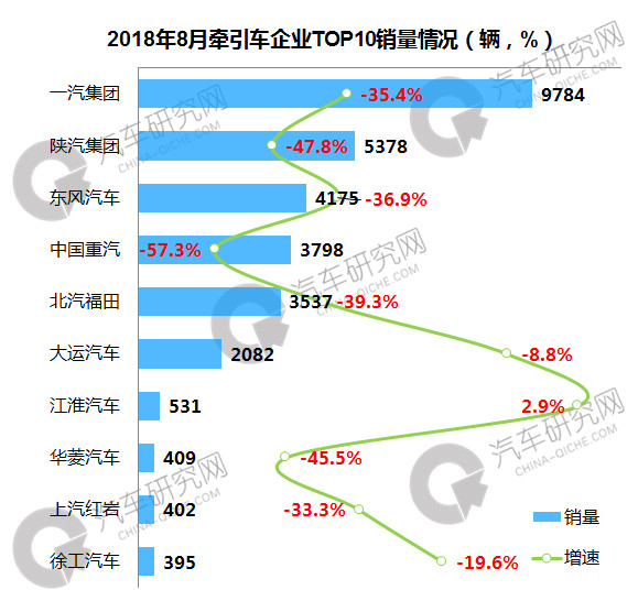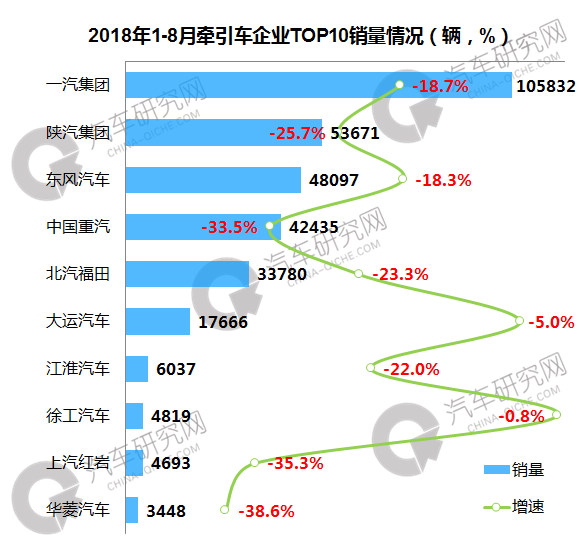 2018年8月牵引车企业:多数企业销量下滑明显 仅江淮