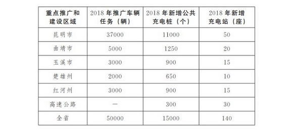 在充电基础设施建设推广方面。按照“桩站先行、适度超前”的原则建设充电基础设施,重点在昆明市、曲靖市、玉溪市、楚雄州、红河州等滇中城市群和旅游城市及景区,加快布局建设充电基础设施,2018年昆明等滇中城市群及城际高速公路新增公共充电桩1.5万个,集中式充电站新增140座以上。其他州、市根据新能源汽车推广情况,积极推进充电基础设施建设。