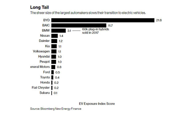 BNEF每年发布一次电动汽车制造商排名,评判标准并不在于电动汽车销量或是电动汽车续航里程,相反,BNEF创造了价值加权指数,即汽车制造商在电动汽车上投入的资源和成本。根据BNEF电动汽车制造商排行榜单: