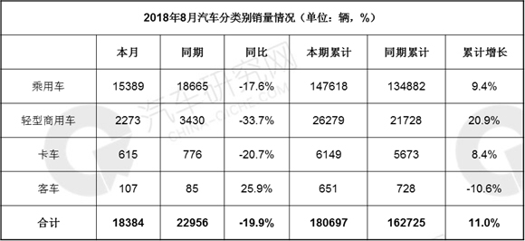 其中,乘用车1-8月累计销量14.8万辆,同比增长9.4%;轻型商用车1-8月累计销量2.6万辆,同比增长20.9%;卡车1-8月累计销量6149辆,同比增长8.4%;客车1-8月累计销量651辆,同比下降10.6%。