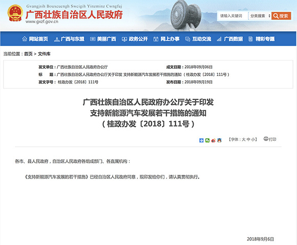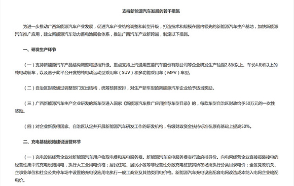 近日从广西壮族自治区人民政府网了解到,广西出台的《支持新能源汽车发展的若干措施》通知对生产新车型的新能源汽车企业给予适当奖励,消费者购置新能源汽车产品的按国家标准的20%给予补贴。上述措施提出,重点支持上汽通用五菱汽车股份有限公司等企业研发生产轴距2.8米以上、车长4.8米以上的纯电动轿车,以及基于此平台开发的纯电动运动型乘用车(SUV)和多功能乘用车(MPV)车型。