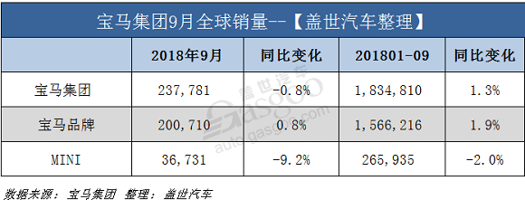 根据宝马集团官方公布的销量数据,今年前三季度,尽管宝马在几个主要市场仍存在阻力,宝马品牌、MINI以及劳斯莱斯品牌全球累计交付量达1,834,810辆,较去年同期微增1.3%。九月份,由于欧洲地区竞争激烈,宝马集团全球销量同比微跌0.8%至237,781辆。