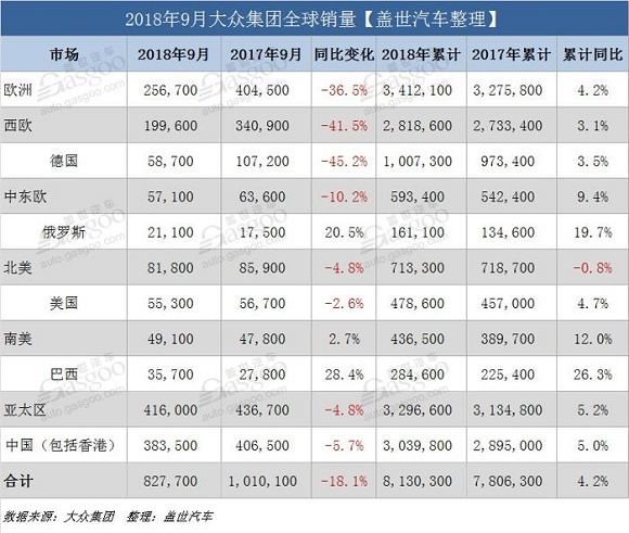 9月份,大众集团在全球共交付827,700辆,较去年同期下跌18.1%,其中西欧销量同比跌幅高达41.5%。今年前三个季度,大众集团全球累计销量依然实现了同比4.2%的正增长,总量也达8,130,300辆。