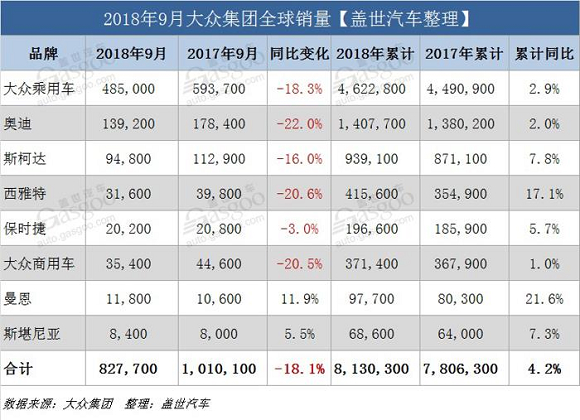 根据大众集团日前公布的全球销量数据,不出所料,由于受到9月1日开始实行的全球统一轻型车测试规程(WLTP)的影响,该集团上个月销量出现了18%的同比下滑。