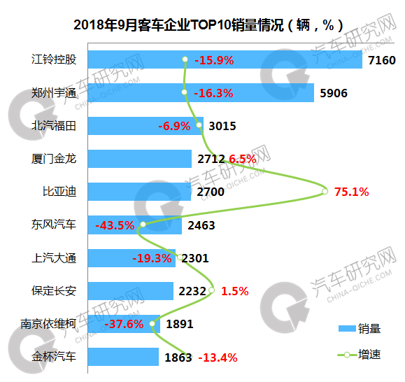 9月客车企业中,江铃控股位居第一,销量达到7160辆,同比下滑15.9%;郑州宇通销量排名次席,销售5906辆,同比下滑16.3%;前十企业中,比亚迪增幅最大,同比增长75.1%。