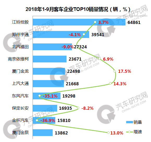 1-9月,客车企业中,江铃控股位居第一,销量达64861辆,同比增长3.7%;郑州宇通销量位居第二,同比下滑4.1%;前十企业中,厦门金龙增幅最大,同比增长17.5%,同时上汽大通和厦门金旅增幅也超过10%。