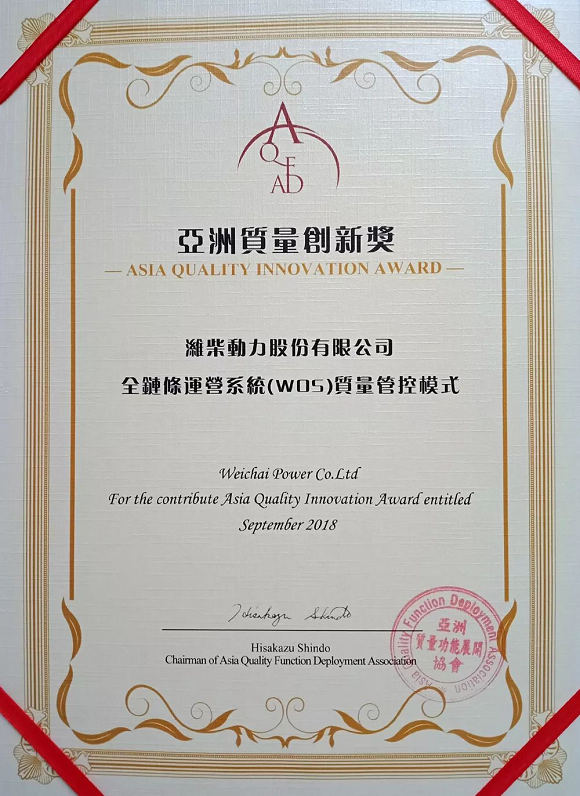 日前,第三届亚洲质量功能展开与创新研讨会上,潍柴动力全链条运营系统(WOS)质量管控模式荣获“2018亚洲质量创新奖”。