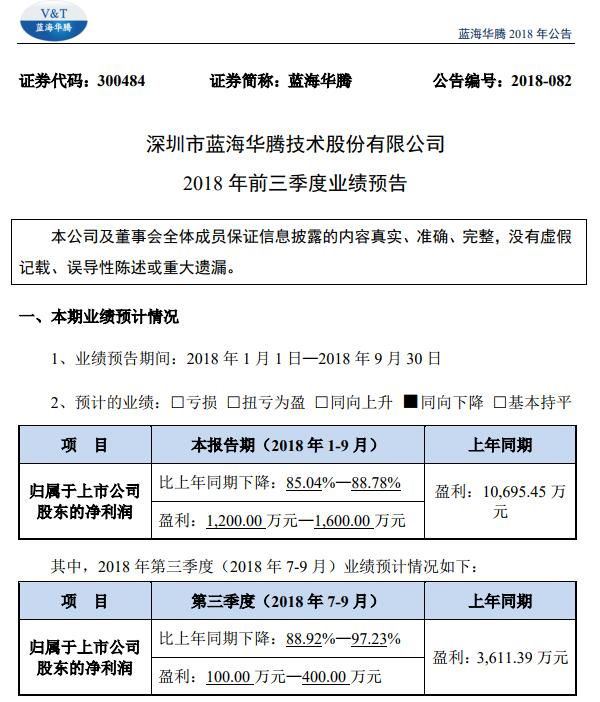 10月15日,蓝海华腾发布前三季度业绩预告,公司前三季度归属于上市公司股东的净利润1200万元—1600万元,同比下降85.04%—88.78%;第三季度归属于上市公司股东的净利润100万元—400万元,同比下降88.92%—97.23%。