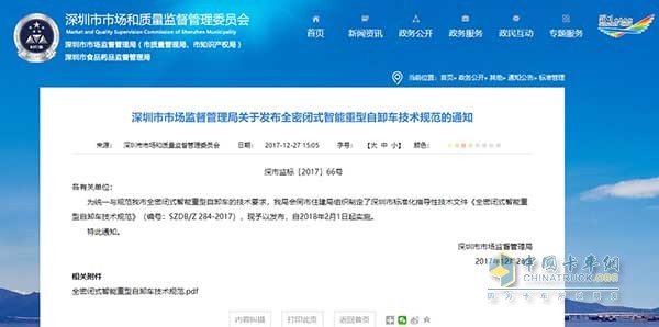 2017年12月26日,深圳市市场监督管理局与各有关部门制定标准化指导性技术文件《全密闭式智能重型自卸车技术规范》,该规范已在2018年2月1日实施,按照新的规范,深圳现有的12000多台渣土车全部都是不合规产品。随着深圳市关于自卸车全密闭式规范化管理的要求,其他城市也有望以深圳为标杆,对渣运运营者和车企提出了更高的要求。满足新政策需求的全密闭式智能自卸车亟待而生。