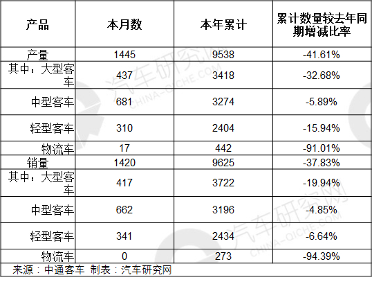▲ 中通轻型客车1-10月累计产量2404辆,同比下降15.94%;1-10月累计销量2434辆,同比下降6.64%。