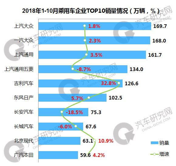 1-10月,乘用车企业中,上汽大众位居第一,销量达到169.7万辆,同比增长1.8%,一汽大众紧随其后,销量达到168万辆,同比增长2.3%;前十企业中,吉利汽车增幅最大,销量增幅达到32.8%。