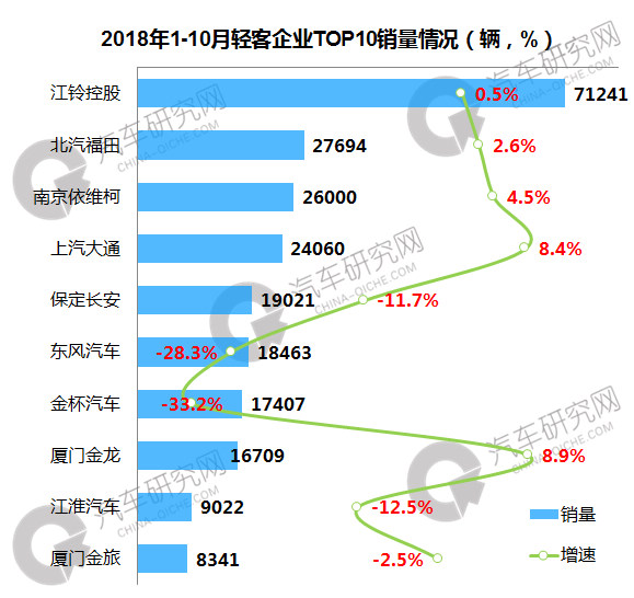 1-10月,轻客企业中,江铃控股位居第一,销量达到71241辆,同比增长0.5%,北汽福田位居第二,销量达到27694辆;前十企业中,厦门金龙和上汽大通增速较大,分别为8.9%和8.4%。