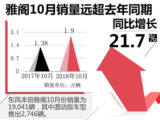 雅阁作为广汽本田旗下的招牌车型,本月售出19,041辆,稳居日系中高级轿车销量冠军,同比去年10月劲增21.7%。在今年8月份推出的雅阁混动车型——雅阁锐·混动也逐渐被消费者认可,本月售出了2,746辆的成绩。