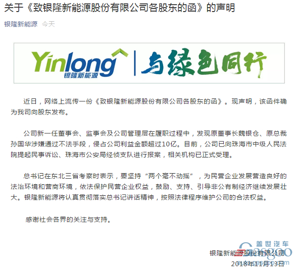 11月13日,银隆新能源股份有限公司通过官方微信发布声明,证实了此前网上流传的一份《致银隆新能源股份有限公司各股东的函》确为其官方发布。该声明如下: