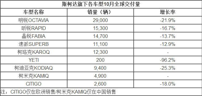从单车型的市场表现来看,斯柯达明锐仍是品牌最畅销车型,10月销量达到29,000辆;晶锐和昕锐也有不错的市场表现,分别交付新车达到14,700辆和15,300辆。SUV车型斯柯达柯珞克的热销为品牌的持续增长做出了重要贡献,新车达到12,300辆。