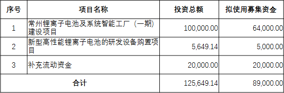 11月19日,鹏辉能源发布公告称,公司拟公开发行可转换公司债券募集资金总额不超过8.9亿元,扣除发行费用后,将用于常州锂离子电池及系统智能工厂(一期)建设项目、新型高性能锂离子电池的研发设备购置项目和补充流动资金。募集资金使用的具体计划如下表所示:
