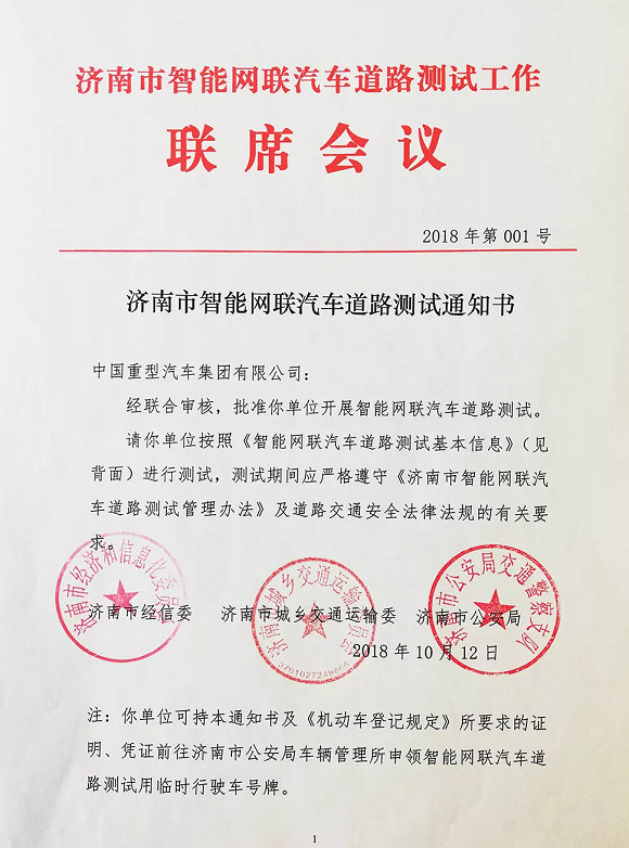 在2018年10月12日召开的济南市智能网联汽车道路测试工作联席会议上,中国重汽获得了济南市智能网联汽车道路测试资质并取得测试牌照。