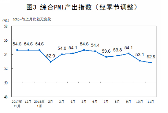 2018年11月份,综合PMI产出指数为52.8%,比上月回落0.3个百分点,表明我国企业生产经营活动继续保持扩张,但活跃度有所减弱。