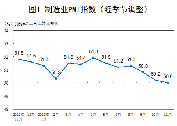 2018年11月份,中国制造业采购经理指数(PMI)为50.0%,比上月小幅回落0.2个百分点,处于临界点。