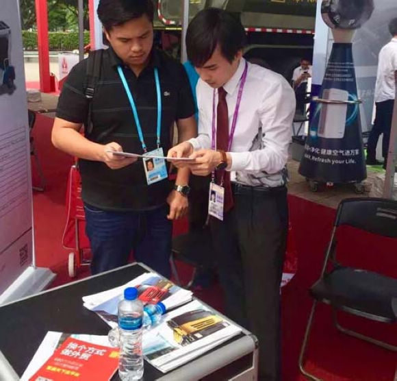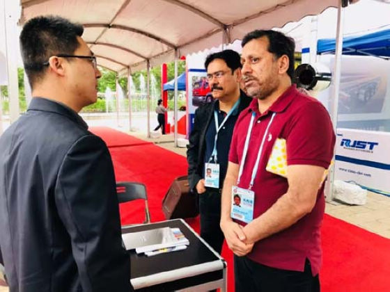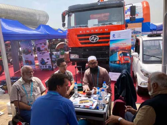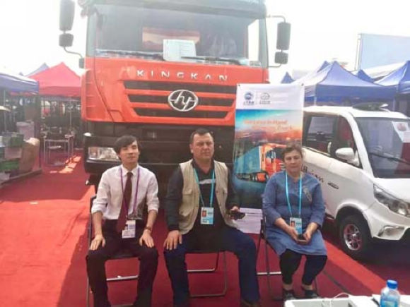 每天来咨询产品和洽谈合作的客户络绎不绝,上汽红岩工作人员都顾不上吃饭,为参观的国外用户介绍红岩产品。