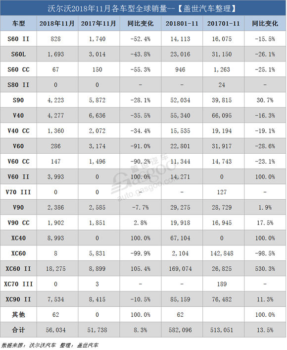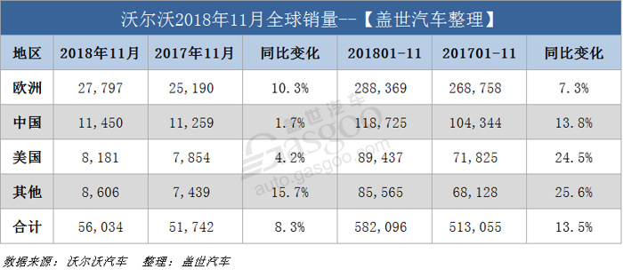 根据沃尔沃汽车官网公布的销量数据,截至11月底,该公司全球销量创下新的记录。今年1至11月份,沃尔沃全球累计销量达582,096辆,较去年同期的513,055辆同比攀升13.5%。这意味着,在2018年还剩一个月的时候,沃尔沃汽车就已经打破了2017年全年销量纪录(571,577辆);同时,这也是该公司连续六年实现年销量创纪录。上个月,沃尔沃共售出56,034辆新车,同比攀升8.3%。