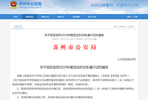 2018年12月3日,苏州市公安局交通警察支队发布了《关于延后发放2019年度货运机动车通行证的通告》。