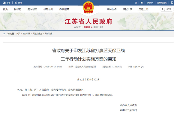 江苏发布打赢蓝天保卫战三年行动计划实施方案