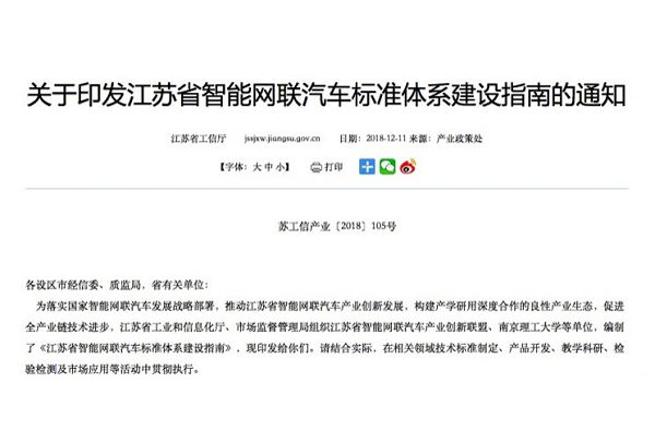 近日,江苏省工信厅、市场监管局联合组织编制并印发《江苏省智能网联汽车标准体系建设指南》(简称“《建设指南》”)。《建设指南》提出,到2022年,江苏将参与制定国家标准15项以上、地方与行业标准20项以上,团体标准30项以上,争取参与制定5-8项国际标准,基本建成江苏省智能网联汽车产业标准体系。
