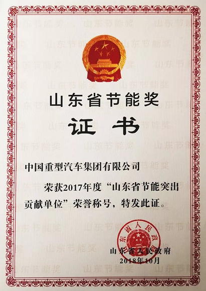 2018年11月,山东省人民政府办公厅下发鲁政办字【2018】190号文件,中国重汽被评为山东省节能突出贡献企业。此前,中国重汽被国家发改委命名为全国节能管理实践双十佳单位,在国家发改委组织的优秀能源案例评选中获得第一名,山东省能源管理体系建设领跑企业,济南市节能突出贡献企业,国家工信部工业领域电力需求侧管理示范企业。