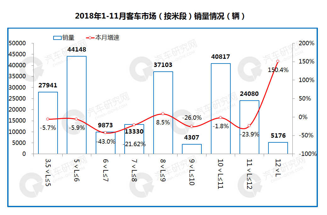1-11月,客车市场主要集中在5-6米、10-11米和8-9米三个米段区间,分别销售44148辆、40817辆和37103辆,同比分别增长-5.9%、-1.8%和8.5%;12米以上客车销量增势喜人,增幅超过150%;其他米段销量均呈现不同程度下滑。