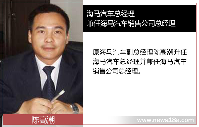 原海马汽车副总经理陈高潮升任海马汽车总经理并兼任海马汽车销售公司总经理。