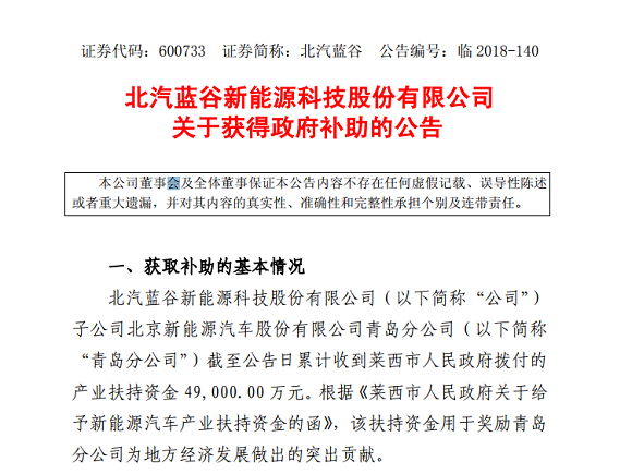 北汽蓝谷是北京新能源汽车股份有限公司(简称“北汽新能源”)的上市载体公司。今年9月27日,北汽新能源成功借壳上市。前三季度,北汽蓝谷净利润1.33亿元,可以看出上述政府扶持资金将对北汽蓝谷2018年度利润总额产生积极影响。