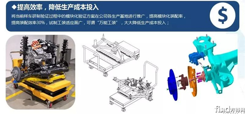 在团队创新方面,为进一步提高试制效率和节拍,节省工装开发数量和开发成本,PPO工程样车试制团队积极探索和思考柔性化的试制方案和工装,不断推行模块化、集成化的试制装配验证。团队已完成前悬架动力总成及后桥总成及冷却模块总成的工装开发,并在实际试制验证工作中得到充分应用,在行业中具有明显优势。实现了动力总成线下模块化装配,提高装配效率2.5倍,减少了人力资源的投入,降低开发成本。