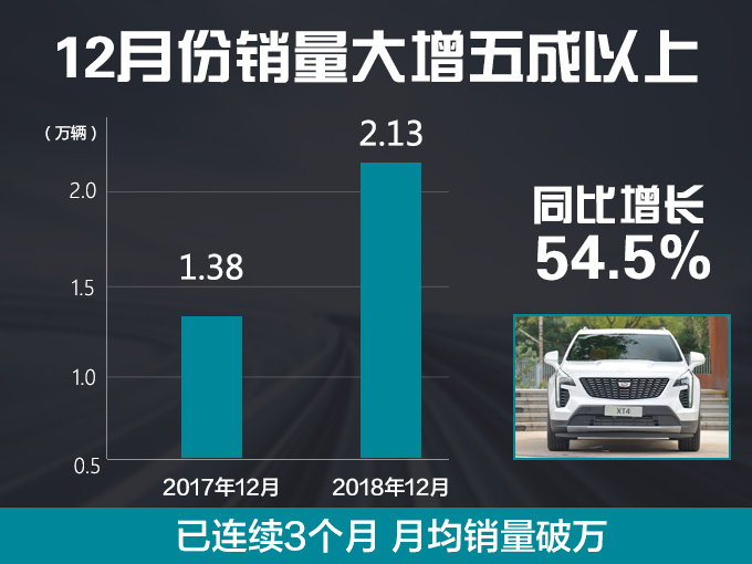 从单月销量来看,2018年12月凯迪拉克在华销售21,347辆新车,同比增长54.5%,环比增长1.6%,这已经是连续第三个月月销量超2万台。在具体车型方面,凯迪拉克在售的5款车型中,除去年8月底上市的XT4外,其余4款车型均实现了同比增长。