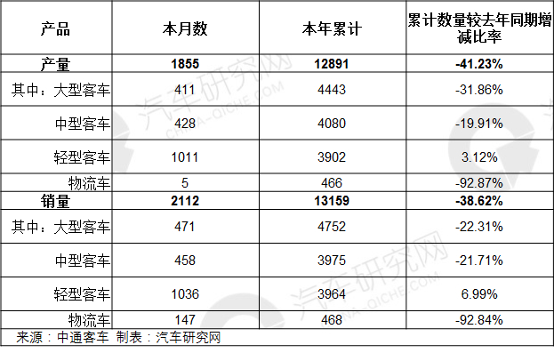 1月8日,中通客车发布12月份产销快报。数据显示,截至12月31日,累计生产客车为12891辆,同比下降41.23%;累计销售13159辆,同比下降38.62%。